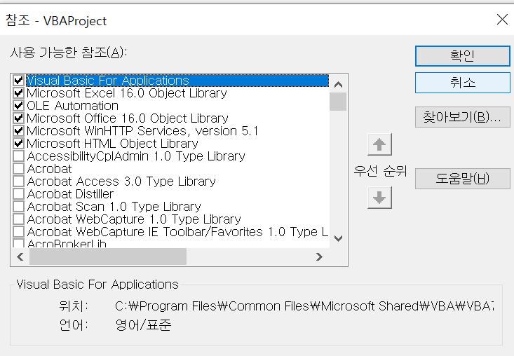 대부분 위의 4개는 이미 추가가 되어있을테고, 아래의 2개만 추가하면 된다(엑셀 365기준)